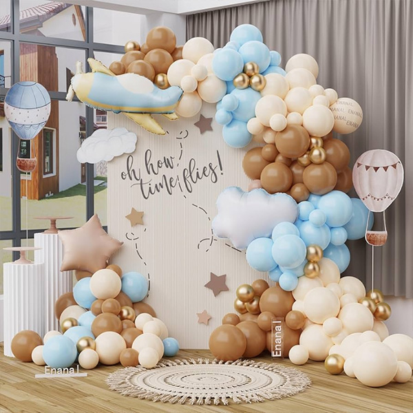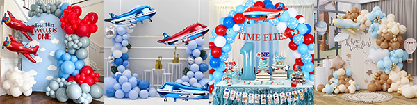 พวงมาลัยบอลลูนพร้อมลูกโป่งฟอยล์เครื่องบิน:มาลัยบอลลูนพร้อมลูกโป่งฟอยล์เครื่องบินนี้ประกอบด้วยลูกโป่งน้ำยาง, ลูกโป่งฟอยล์,จุดกาวลูกโป่ง,สายเบ็ด และอุปกรณ์ลูกโป่งอื่นๆ การใช้อุปกรณ์เสริมเหล่านี้ช่วยให้คุณสร้างซุ้มลูกโป่งได้อย่างง่ายดาย ลูกโป่งน้ำยางและลูกโป่งฟอยล์ของเราผลิตจากยางธรรมชาติและวัสดุอลูมิเนียมฟอยล์คุณภาพสูงซึ่งมีความปลอดภัยและปลอดสารพิษและสามารถสร้างซุ้มพวงมาลัยลูกโป่งที่สวยงามได้ พวงมาลัยบอลลูนบนเครื่องบินนี้เหมาะสำหรับฉากที่มีธีมหลากหลาย รวมถึงปาร์ตี้วันเกิด ปาร์ตี้ในธีมเครื่องบิน ปาร์ตี้ในธีมแมลงวันเวลา และปาร์ตี้พิธีรับขวัญเด็ก เหมาะอย่างยิ่งสำหรับการเพิ่มสีสันให้กับการเฉลิมฉลองใดๆ