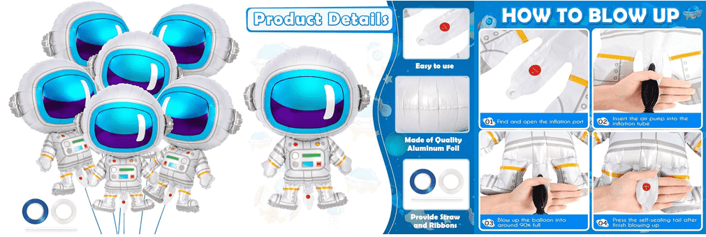 ชุดลูกโป่งฟอยล์นักบินอวกาศมีขนาดเล็กและประณีต สะดวก และง่ายต่อการสร้าง โดยวางนักบินอวกาศไว้ตรงกลางงานปาร์ตี้ และมีบอลลูนดาวเคราะห์ล้อมรอบงานปาร์ตี้ ดวงดาวดึงดอกไม้ทั้งสองด้านโดยไม่ต้องใช้เครื่องมือที่ซับซ้อน ชุดสูทขนาดเล็กเหมาะสำหรับการตกแต่งงานเลี้ยงวันเกิดของครอบครัวขนาดเล็กและห้องเด็กทุกวัน เป็นจุดนาฬิกาลมในอวกาศที่สว่างสดใส