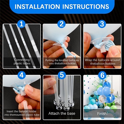 ดังที่แสดงในรูปภาพ 2 และรูปภาพ 3 ด้านล่างก่อนอื่นให้แบ่งอุปกรณ์ประกอบบอลลูนอุปกรณ์เสริมต่าง ๆ ยืนเป็นหมวดหมู่และกำหนดตำแหน่งการประกอบของแต่ละอุปกรณ์เสริม จากนั้นท่อพลาสติกจะเชื่อมต่อผ่านข้อต่อจากนั้นบอลลูนที่ผูกปมจะถูกใส่เข้าไปในรูของการรองรับบอลลูนปมบอลลูนถูกบิดและดึงเข้าไปในรูอื่น ๆ ของข้อต่อและในที่สุดการรองรับบอลลูนเชื่อมต่อกับท่อและปลายอีกด้านหนึ่งของท่อเชื่อมต่อกับฐานที่มีกาว ทำบอลลูนที่สวยงามเสร็จแล้ว ยิ่งไปกว่านั้นเสาพ่วงบอลลูนที่ประกอบกันยังสามารถถอดประกอบได้อย่างง่ายดายและสามารถใช้เป็นของเล่นแท่งบอลลูนแท่งสำหรับเด็กได้ตระหนักถึงการใช้งานหลายเสาและการใช้งานที่ยืดหยุ่น นอกจากนี้ยังสามารถใช้ขาตั้งพื้นบอลลูนที่ประกอบไปด้วยแสงสีได้ ถ้าคุณชอบไฟสีคุณสามารถซื้อไฟสีในขณะที่ซื้อบอลลูนพื้นยืนเพื่อให้กิจกรรมของคุณมีสีสันมากขึ้น!