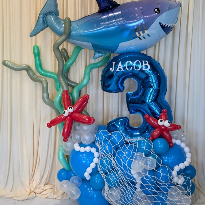2. ฟอยล์บอลลูน:พวงมาลัยบอลลูนพร้อมบอลลูนฟอยล์ปลาฉลามแพ็คเกจนี้มีลูกโป่งฟอยล์กับสิ่งมีชีวิตทางทะเลการ์ตูนต่างๆเช่นฉลามปลาดาวแมงกะพรุนและม้าน้ำ นอกจากนี้เรายังสามารถออกแบบลูกโป่งฟอยล์ที่กำหนดเองให้คุณตามรูปแบบของคุณเพื่อสร้างพวงมาลัยบอลลูนที่ไม่เหมือนใครด้วยลูกโป่งฟอยล์ฉลาม
