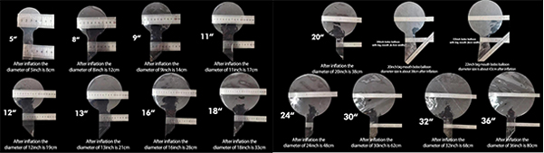 ลูกโป่ง Bobo Transparent มีให้เลือกหลายขนาดที่ระบุไว้ที่นี่ ขนาดที่แตกต่างกันสอดคล้องกับโมเดลที่แตกต่างกันและมิติที่สูงเกินจริงโดยรวม คุณสามารถปรับแต่งขนาดของคุณได้