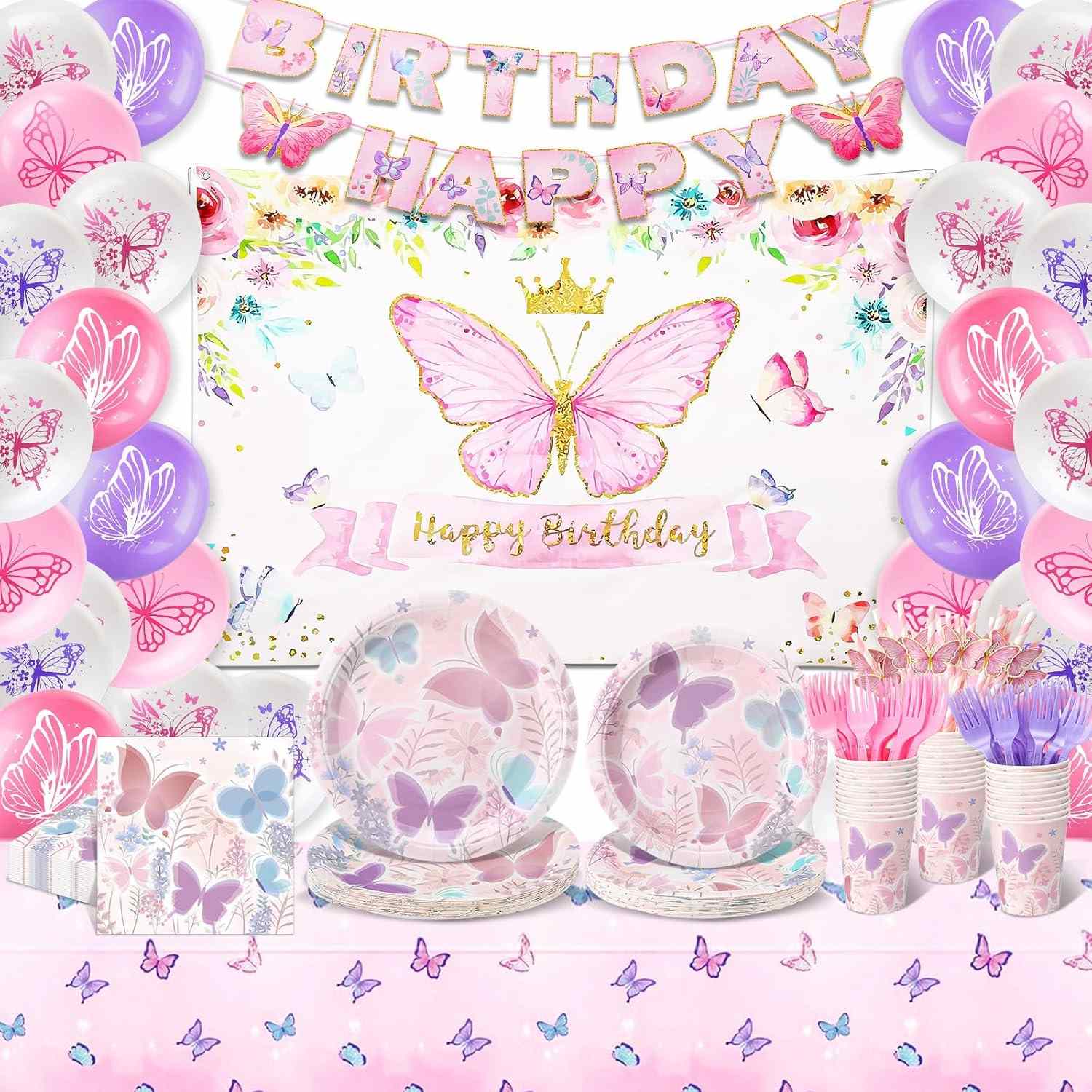 การออกแบบใช้ผีเสื้อหลากสีสันเป็นหลัก ผสมกับดอกไม้และฝุ่นแวววาว สีสันสดใสและมีหลายสไตล์ มีโทนสีเขียว โทนชมพู ม่วง และโทนโรสโกลด์ รูปร่างตัวอักษรดูพิเศษ สามารถจับคู่กับไม้แขวนผีเสื้อหรือผีเสื้อเกลียวได้ รูปลักษณ์ทั้งหมดรู้สึกเต็มอิ่มและสมบูรณ์ แบนเนอร์ตัวอักษรผีเสื้อสีชมพูและสีม่วงพร้อมผีเสื้อ 3 มิติและริบบิ้นเนื้อนุ่มสามารถแขวนบนผนังหรือเพดานได้ มันทำให้พื้นที่ปาร์ตี้สว่างขึ้นอย่างรวดเร็ว และทำให้คำว่า “สุขสันต์วันเกิด” ดูเหมือนเปิดอยู่ระหว่างปีกผีเสื้อ