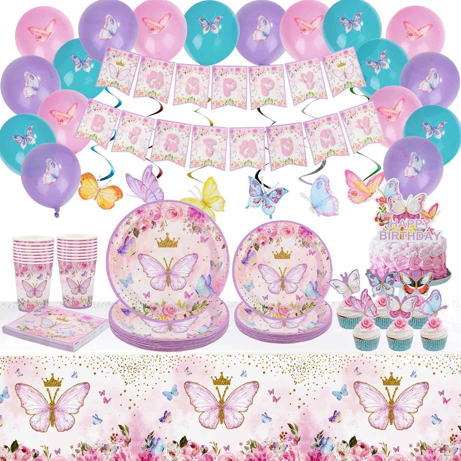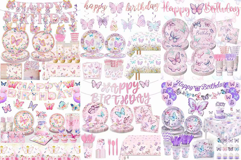 ตัวเลือกที่ยอดเยี่ยมสำหรับการตกแต่งงานปาร์ตี้คือชุดเครื่องใช้บนโต๊ะอาหารสำหรับปาร์ตี้ผีเสื้อ ในชุดประกอบด้วยผ้าเช็ดปาก จานกระดาษ ถ้วยกระดาษ ส้อม และมีด แต่ละชิ้นจะแสดงชิ้นส่วนของผีเสื้อ