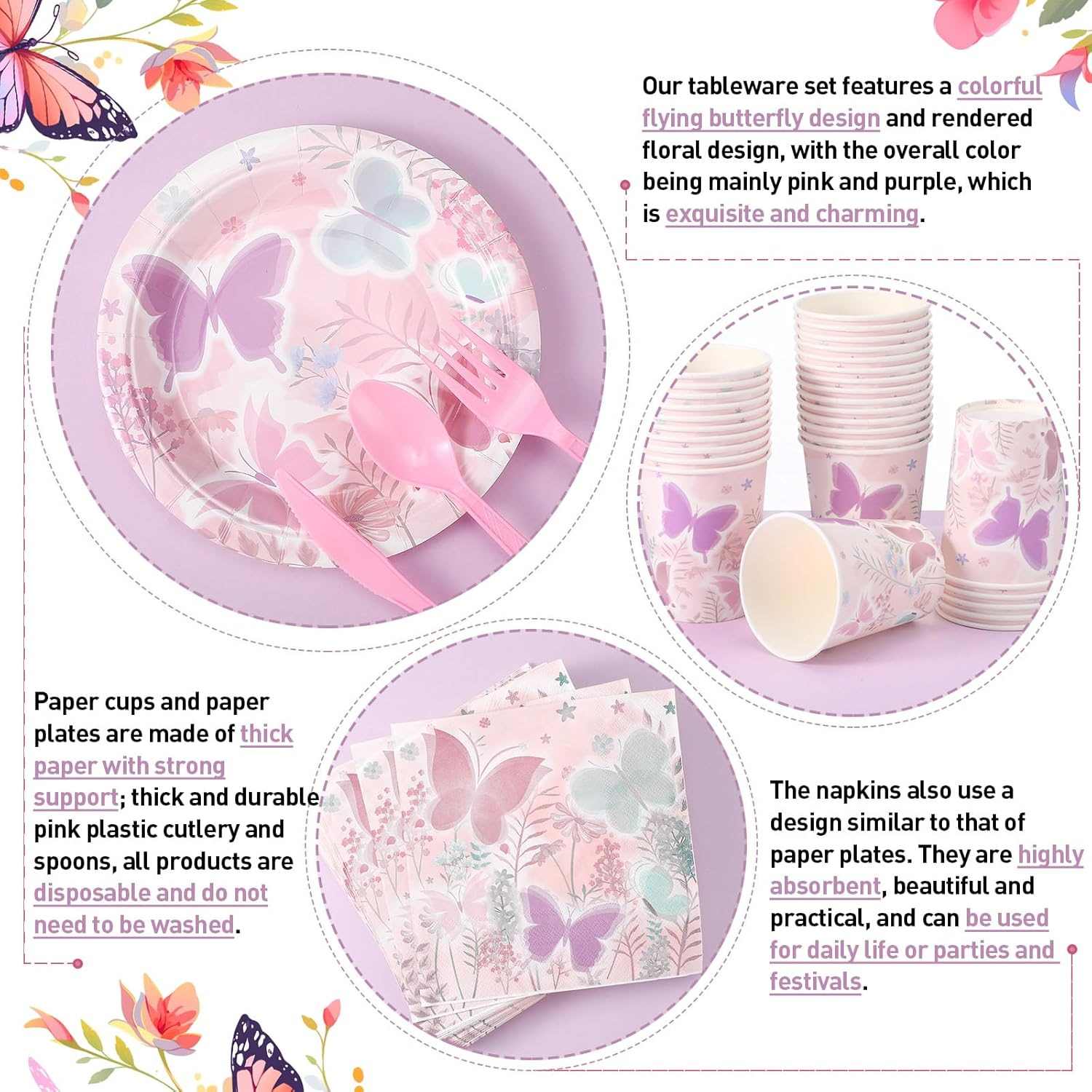 โซลูชันแบบกำหนดเองมีความยืดหยุ่น จำนวนชุดจานชามสามารถเปลี่ยนแปลงได้ตามขนาดของงานปาร์ตี้ รูปแบบลวดลายสามารถเปลี่ยนแปลงได้เช่นกัน สามารถโชว์ธีมต่างๆหรือดูการ์ตูนน่ารักๆได้ สามารถเพิ่มข้อความได้ เช่น ชื่อหรือป้ายปาร์ตี้ ชุดจานชามรูปผีเสื้อแต่ละชุดดูพิเศษและเก็บความทรงจำสำหรับงานปาร์ตี้