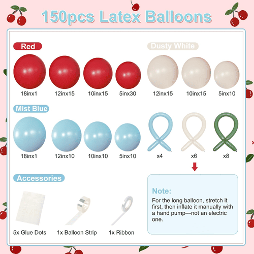 ลูกโป่งน้ำยางของซุ้มลูกโป่งดอกซากุระทำจากน้ำยางดิบ 100% ซึ่งนำเข้าจากเอเชียตะวันออกเฉียงใต้ วัสดุนี้เป็นมิตรกับสิ่งแวดล้อมและไม่เป็นอันตรายต่อเด็กและผู้ใหญ่โดยสิ้นเชิง ขนาดของพวกเขาคือตั้งแต่ 5 นิ้วถึง 18 นิ้ว ลูกโป่งยางสีแดงขนาด 5 นิ้วและลูกโป่งยางยาวสีเขียวใช้สร้างสไตล์เชอร์รี่จิ๋วน่ารัก