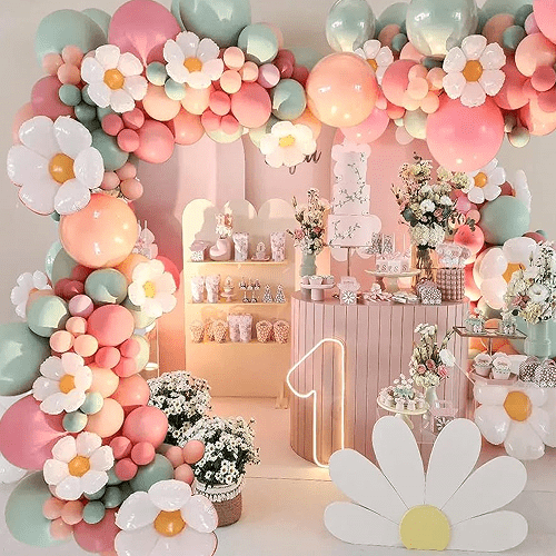 งานเลี้ยงวันเกิด: พวงมาลัยลูกโป่งเดซี่สามารถใช้เป็นตกแต่งพื้นหลังสำหรับงานวันเกิดได้ เหมาะสำหรับจัดงานวันเกิดของเด็กหรือผู้หญิง สร้างบรรยากาศที่สนุกสนาน
