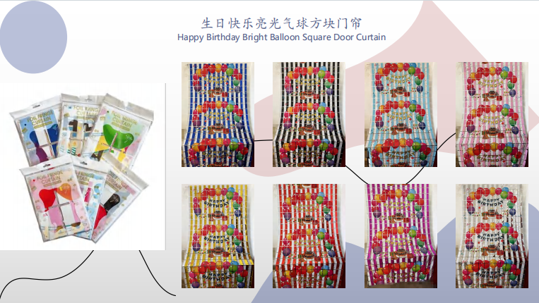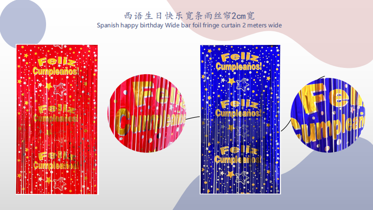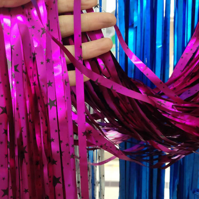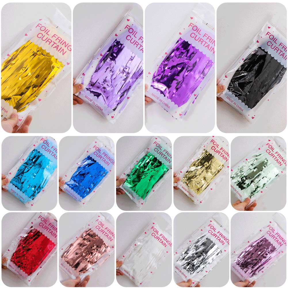 ผ้าม่านฟอยล์ที่มีสีรุ้งสีมาการูนและการผสมสีอื่น ๆ เหมาะสำหรับงานวันเกิดของเด็ก นอกจากนี้ยังมีผ้าม่านฟอยล์ฟอยล์เงาเช่นทองคำและเงินซึ่งเหมาะสำหรับงานวันเกิดผู้ใหญ่การเฉลิมฉลองครบรอบ ฯลฯ พวกเขาสามารถจัดได้ที่ไซต์ปาร์ตี้ห้องจัดเลี้ยงโรงแรม ฯลฯ