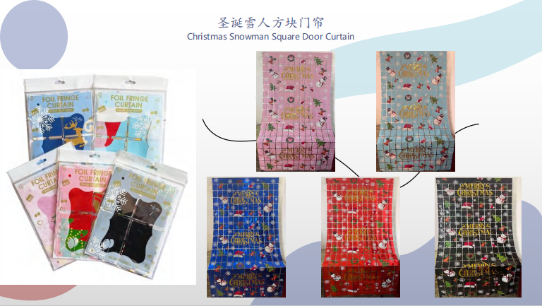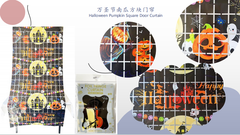 เช่นม่านสีเขียวและสีแดงฟอยล์สีเขียวและสีแดงม่านสีดำและสีส้มฟอยล์และม่านฟอยล์กับฟักทองค้างคาวแมงมุมและรูปร่างอื่น ๆ ซึ่งสามารถใช้สำหรับการตกแต่งวันหยุดในบ้านห้างสรรพสินค้าบาร์และสถานที่อื่น ๆ