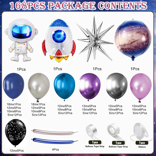 พวงมาลัยบอลลูนธีมกาแล็กซี่มาพร้อมกับคุณภาพสูงลูกโป่งน้ำยางและลูกโป่งฟอยล์ สีของลูกโป่งคือ สีม่วง ชมพู ฟ้า และเศษไม้ ซึ่งเป็นสัญลักษณ์ของกาแล็กซี แพ็คเกจนี้ได้รับความนิยมอย่างสูงจากผู้คนจำนวนมาก รวมถึงผู้ชื่นชอบดาราศาสตร์และผู้ชื่นชอบอวกาศ จึงสามารถนำมาซึ่งผลลัพธ์การขายที่ยอดเยี่ยมให้กับธุรกิจของคุณได้