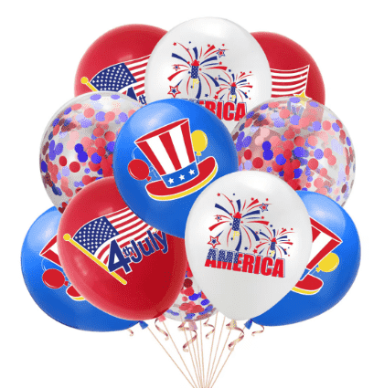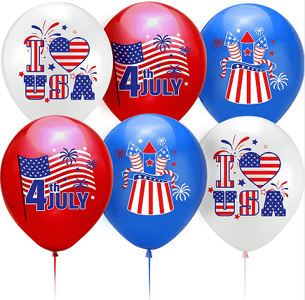 ลูกโป่ง Happy 4th of July ทำจากวัสดุที่ปลอดภัยและเป็นมิตรกับสิ่งแวดล้อม ลูกโป่งยางเป็นน้ำยางธรรมชาติ 100% และลูกโป่งฟอยล์เป็นฟิล์มฟอยล์เกรดอาหาร