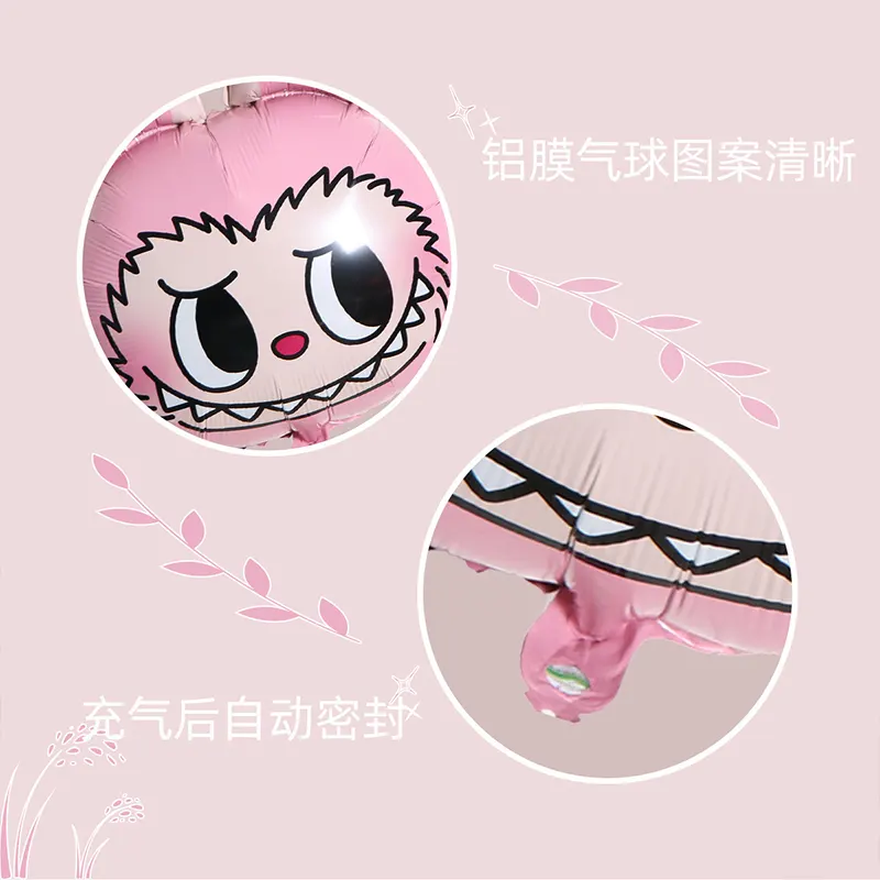 คุณสมบัติการออกแบบ: กึ่งกลางอยู่ที่รูปร่างหูกระต่ายอันเป็นเอกลักษณ์ของ Labubu มันมีการแสดงออกพื้นฐานหกอย่างเช่นสีชมพูยิ้ม, หน้าสีแดงน่ารักและดวงตาตลกสีน้ำตาล เมื่อรวมกับเทคโนโลยีการไล่ระดับสีพื้นผิวมันวาวของบอลลูนคือ≥90°
