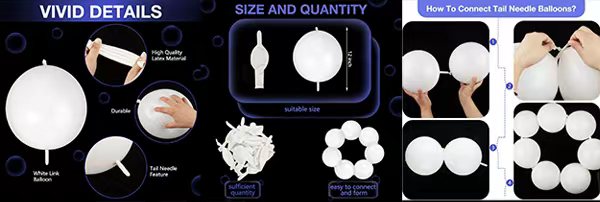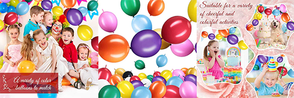 ไม่ว่าจะเป็นปาร์ตี้วันเกิดงานแต่งงานการเฉลิมฉลองหรือโอกาสอื่น ๆ โดยการจับคู่ลูกโป่งที่มีสีเดียวกันหรือสีอื่น ๆ คุณสามารถสร้างบรรยากาศที่สง่างามที่คุณต้องการ พวกเขาจะเป็นการปรุงแต่งที่สมบูรณ์แบบสำหรับวันครบรอบวันฮาโลวีนงานเลี้ยงต้อนรับทารกปาร์ตี้คริสต์มาสหรือกิจกรรมอื่น ๆ ลูกโป่งเชื่อมโยงเป็นตัวเลือกที่เหมาะสำหรับการสร้างบรรยากาศที่เป็นเอกลักษณ์และดึงดูดความสนใจ