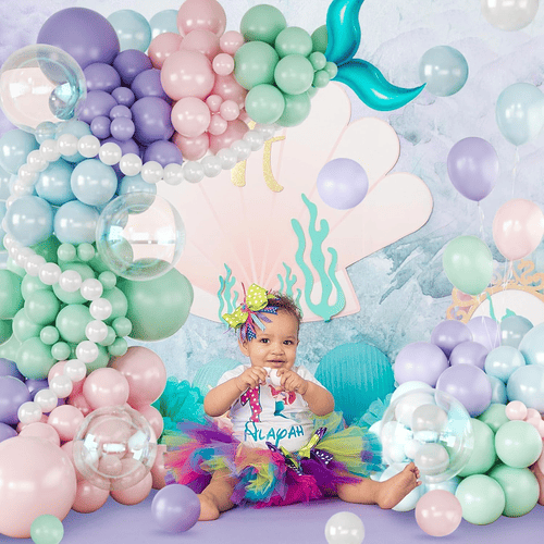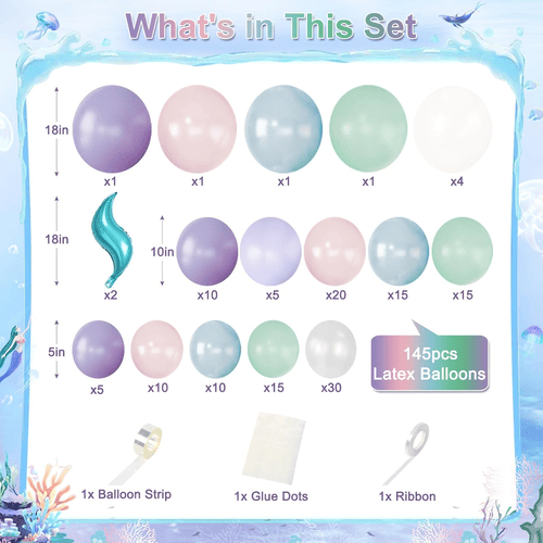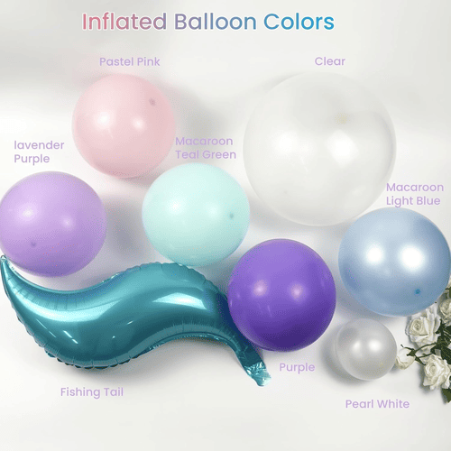 ลูกโป่งในพวงมาลัยบอลลูนนางเงือกมีหลายสี เช่น ม่วง ลาเวนเดอร์ ชมพูพาสเทล ฟ้าอ่อน เขียวนกเป็ดน้ำ สีขาวมุก และโปร่งใส พร้อมทั้งฟอยล์ตกแต่งหางนางเงือก ทำให้เหมาะสำหรับสร้างปาร์ตี้ในธีมมหาสมุทรนางเงือกที่มีมนต์ขลัง