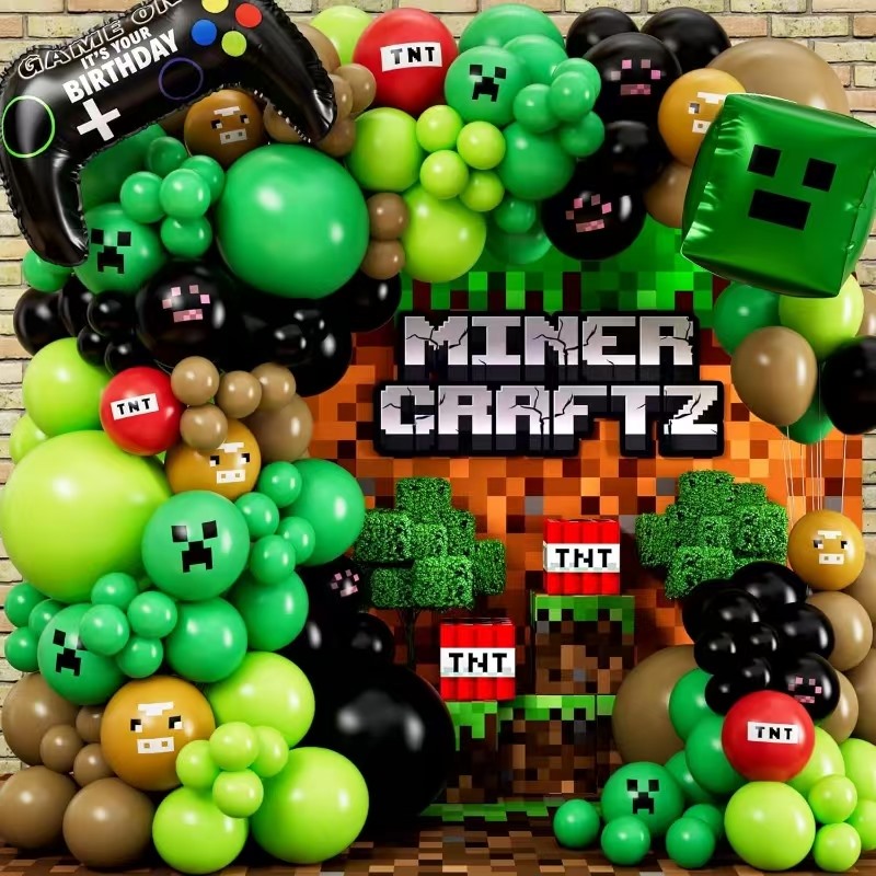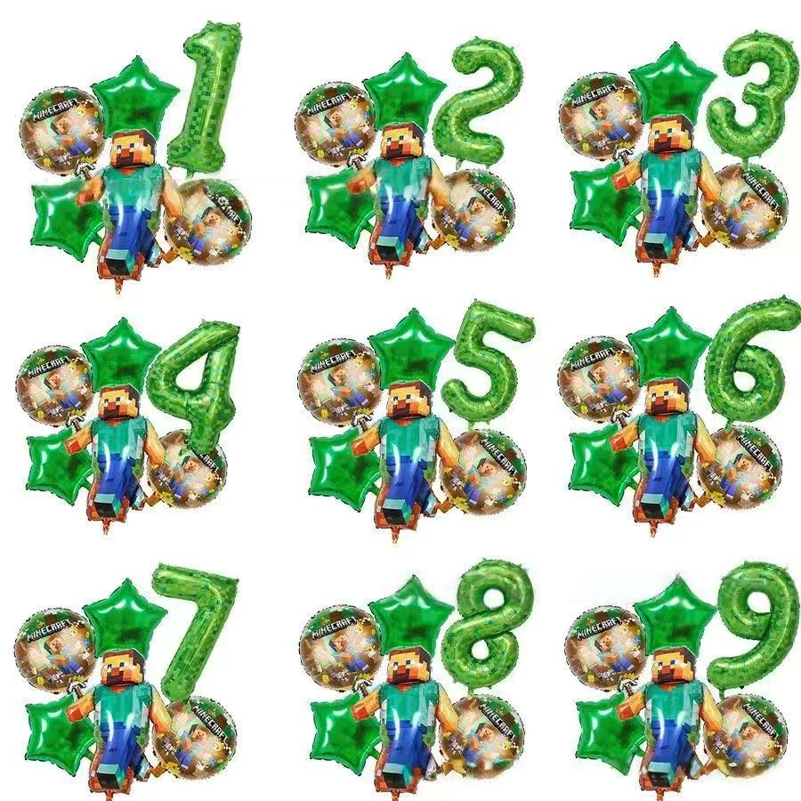 บอลลูนฟอยล์จำนวน Minecraft ได้รับแรงบันดาลใจจากรูปแบบพิกเซลของชั้นหญ้าและชั้นสกปรกในเกม พวกเขามาในรูปทรงสีเขียวครอบคลุม 1 ถึง 9 พื้นผิวพิกเซลบนตัวเลขจะคัดลอกสไตล์เกม จับคู่กับบล็อกหญ้าที่ตรงกันและลูกโป่งดาว จอแสดงผลอายุยังมีรูปลักษณ์ minecraft พวกเขาเป็นไฮไลต์ที่สนุกสนานสำหรับงานวันเกิด