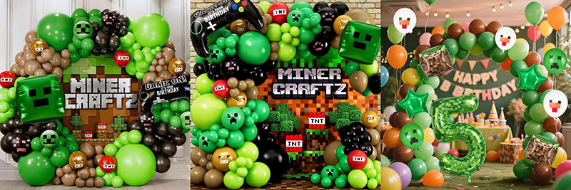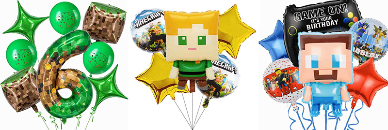 ลูกโป่งฟอยล์รูปทรงพิเศษ Minecraft ผสมผสานจินตนาการและองค์ประกอบของเกม พวกเขามีรูปร่างตัวละคร 3 มิติมากมาย ตัวละครรวมถึง Steve, Creeper และ Enderman แต่ละคนคัดลอกรายละเอียดเกม นอกจากนี้ยังมีรายการเช่นดาบเพชรบล็อกทีเอ็นทีและตัวควบคุมเกม พวกเขาทำให้การตกแต่งปาร์ตี้สนุกและรวยมากขึ้น บอลลูนแต่ละตัวใช้สไตล์พิกเซล Creeper มีตัวบล็อกสีเขียว สตีฟมีเสื้อเชิ้ตสีน้ำเงิน รายละเอียดทำให้โลกบล็อกรู้สึกเหมือนอยู่ในงานปาร์ตี้จริง