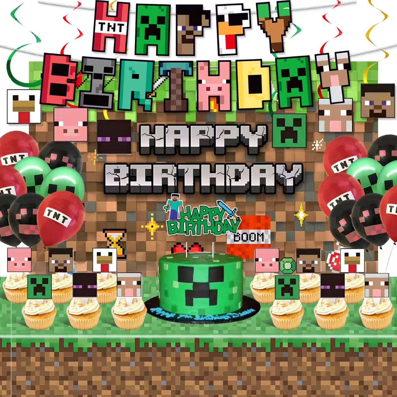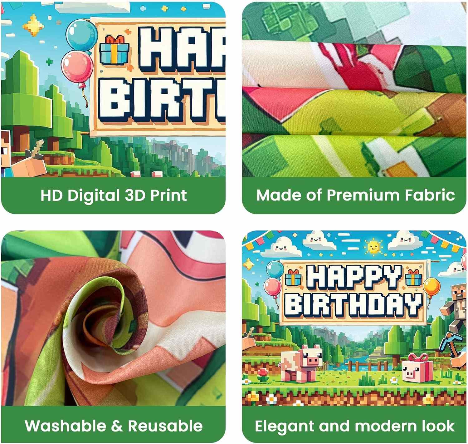ฉากหลัง Minecraft เป็นส่วนสำคัญของฉากปาร์ตี้ การออกแบบใช้ความคิดจากชิ้นส่วนเกมคลาสสิก มันแสดงให้เห็นถึงท้องฟ้าพิกเซลหญ้าต้นไม้อาคารและสตีฟ ชิ้นส่วนเหล่านี้เข้าร่วมเพื่อสร้างฉากโลกแบบเต็มบล็อก ภาพมีสีสดใส ภาพมีเลเยอร์ที่อุดมสมบูรณ์ คำว่าสุขสันต์วันเกิดในสไตล์พิกเซลดูชัดเจน คำพูดจับตา ฉากหลังทำให้สถานที่ปาร์ตี้ให้ความรู้สึกเหมือนเป็นเกมในเกมเดียว