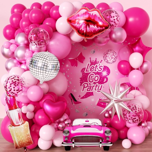ชุดประกอบด้วยลูกโป่งน้ำยางสีชมพูเคลือบขนาด 5 นิ้วและ 12 นิ้ว, ลูกโป่งน้ำยางสีชมพูมุกขนาด 5 นิ้วและ 12 นิ้ว, ลูกโป่งน้ำยางสีชมพูเมทัลลิกขนาด 5 นิ้วและ 12 นิ้ว, ลูกโป่งน้ำยางสีขาวขนาด 5 นิ้วและ 12 นิ้ว, ลูกโป่งน้ำยางข้นสีชมพูขนาด 12 นิ้ว, ลูกโป่งฟอยล์หัวใจสีชมพูและสีขาวขนาด 18 นิ้ว, ลูกโป่งฟอยล์รูปดาวขนาด 18 นิ้ว, ม่านฟอยล์สีชมพู, ลูกโป่งฟอยล์สุขสันต์วันเกิดสีชมพู, ตกแต่งผีเสื้อและอุปกรณ์เสริมต่างๆ เช่นจุดกาว, แถบลูกโป่งและริบบิ้น