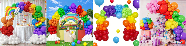 ลูกโป่งสีรุ้งด้านมีสีแดง ส้ม เหลือง เขียว เทอร์ควอยซ์ และน้ำเงินเป็นหลัก สีสันที่สดใสและหลากหลายเหล่านี้จะทำให้พื้นที่ที่น่าเบื่อดูมีชีวิตชีวา