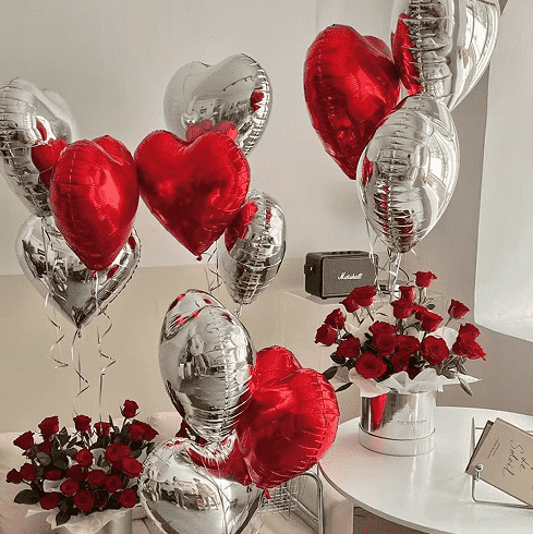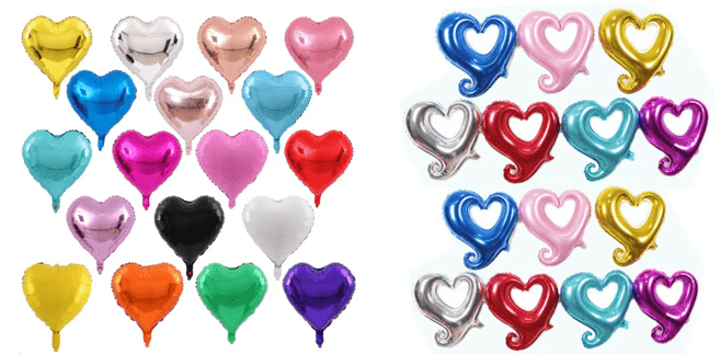 ลูกโป่งฟอยล์จานไฟรูปหัวใจ มีสีพื้นหลังล้วนๆ เช่น แดง ชมพู ข้าวขาว ฯลฯ เหมาะสำหรับใช้เป็นวัสดุรองตกแต่งขั้นพื้นฐาน บอลลูนฟอยล์กรอบรูปหัวใจใช้โครงสร้างกรอบกลวงสามมิติ ซึ่งสามารถยืนที่โต๊ะลงชื่อเข้าใช้ปาร์ตี้เป็นพื้นที่จัดแสดง หรือแขวนเหนือโต๊ะรับประทานอาหารเป็นของตกแต่งแบบโฟกัส ลูกโป่งฟอยล์รูปหัวใจพิมพ์ลาย ธีมวันวาเลนไทน์ เช่น กุหลาบ ความรัก ลูกศรกามเทพ และอื่นๆ พิมพ์บนพื้นผิว สีสันสดใส และไม่ง่ายที่จะสร้างบรรยากาศรื่นเริง.