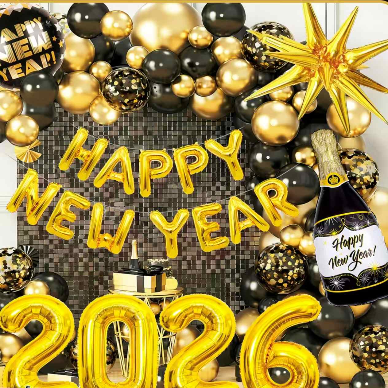 คิดถึงชุดธีมปีใหม่ มีลูกโป่งฟอยล์ที่มีลักษณะคล้ายขวดแชมเปญ นอกจากนี้ยังมีลูกโป่งตัวเลข "2026" ลูกโป่งประดับรูปดาว และอื่นๆ อีกมากมาย สีหลักคือสีดำทองหรือสีขาวทอง เต็มไปด้วยเสียงเชียร์เทศกาลปีใหม่ สามารถสร้างฉากปาร์ตี้ปีใหม่ที่หรูหราและเป็นพิธีการได้อย่างง่ายดาย